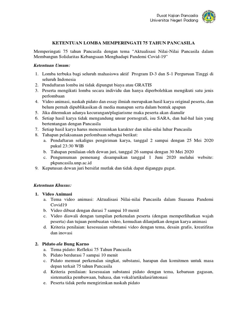 Memperingati 75 Tahun Kelahiran Pancasila, UNP Mengadakan Lomba Kreativitas Mahasiswa Seluruh Indonesia | Ganto.co