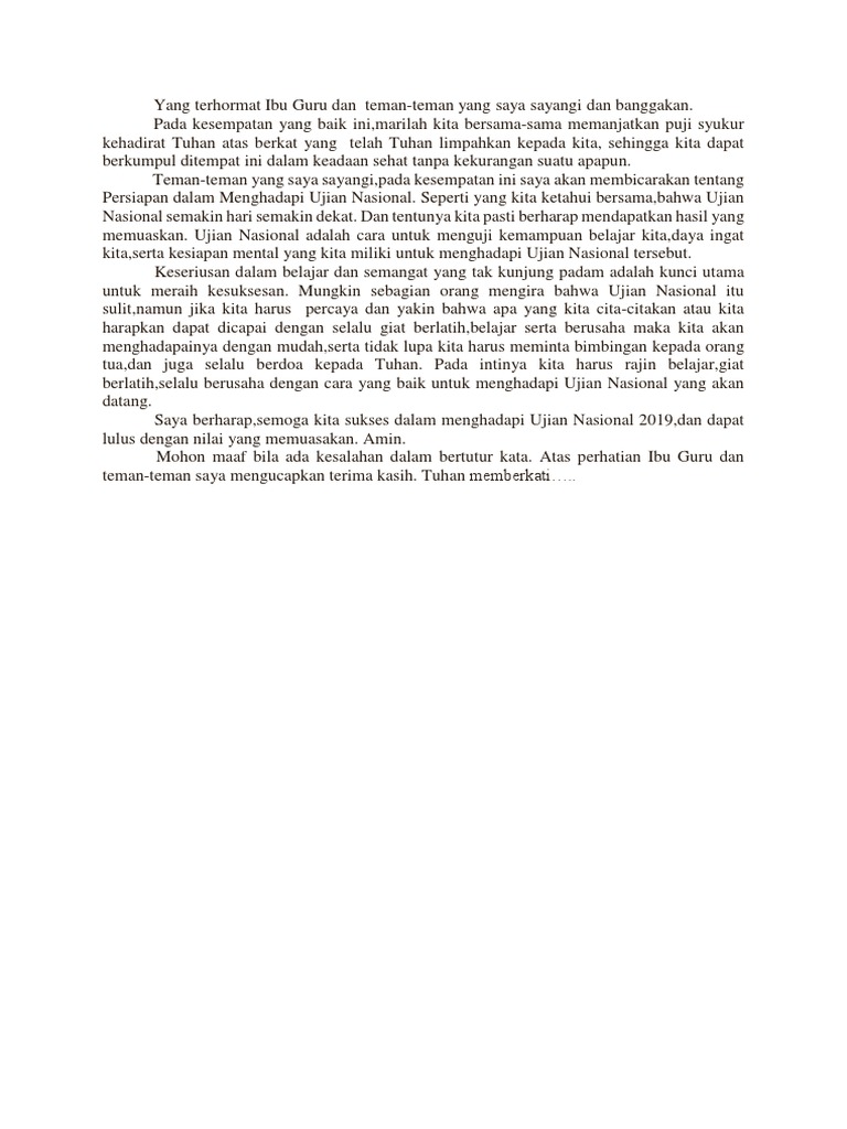 Pidato tentang persiapan menghadapi ujian nasional Assalamu alaikum wr. Wb. Ibu guru yang saya hormati dan teman-teman yang say