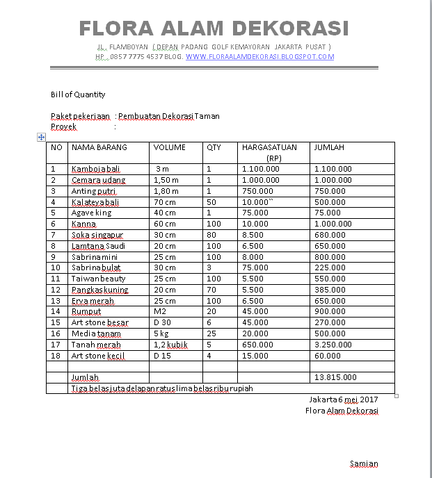 cara membuat Proposal estimasi Harga dan Spk Taman – Samian binti ibu sani