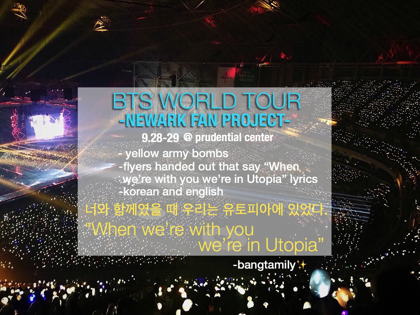 hobiurary on Twitter: “Newark Euphoria Project! BTS WORLD TOUR prudential center 9.28-29 Goal: To surprise Bangtan on stage with flyers that say “When we’re with you, we’re in Utopia” in English