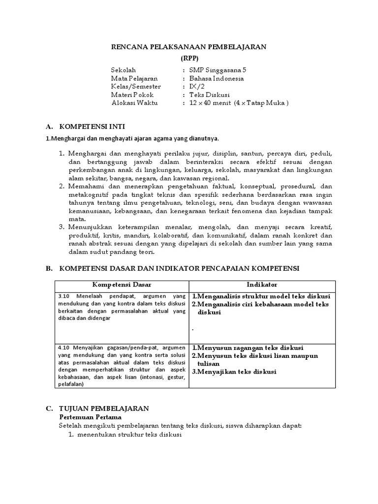 RPP 1 Lembar SMP Bahasa Indonesia Kelas 7 8 9 Revisi 2020 Halaman all - Kompasiana.com