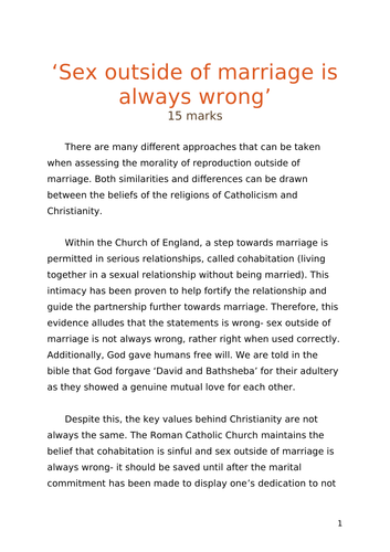 GCSE RS Essay- Sex Outside of Marriage is Always Wrong (15 marks) | Teaching Resources