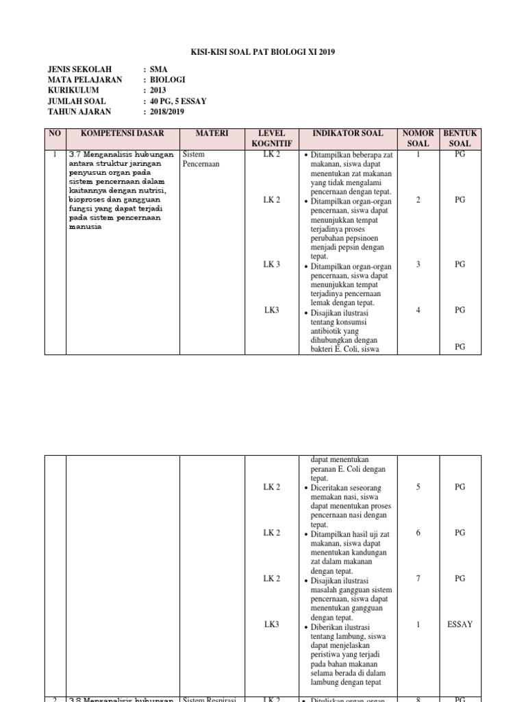 Kisi-kisi Soal Pat Xi Biologi k 13
