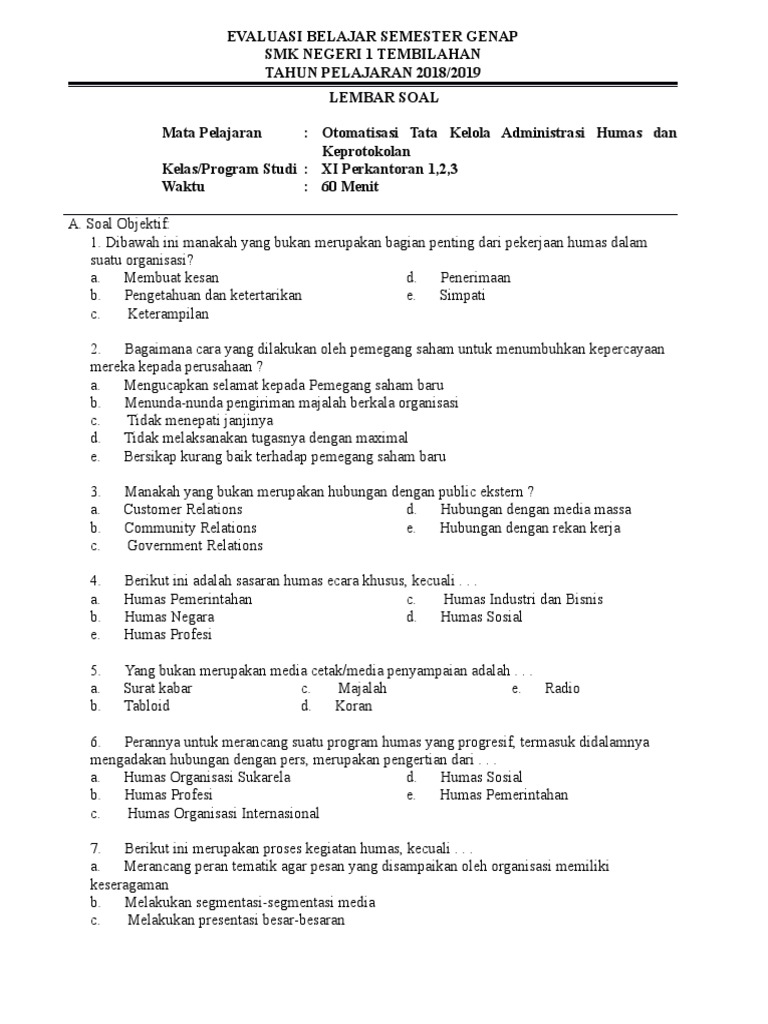 DOC) CONTOH SOAL ADMINISTRASI HUMAS DAN KEPROTOKOLAN SMK | Idan …
