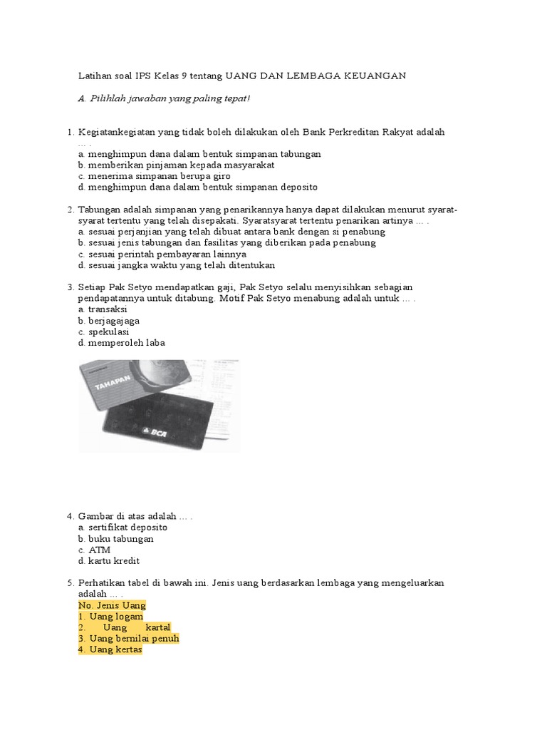 Latihan Soal Ips Kelas 9 Tentang Uang Dan Lembaga Keuangan