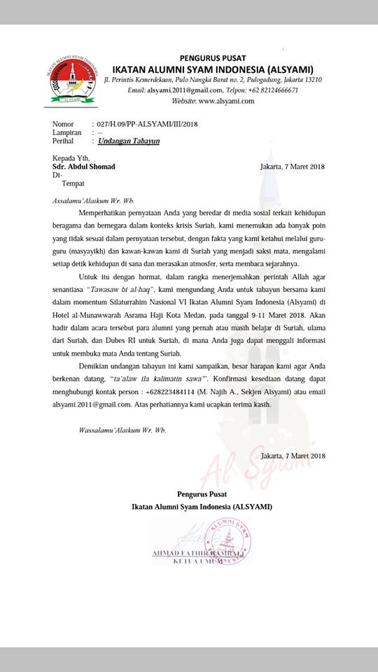 [ ](https://3.bp.blogspot.com/-7AQGjRAK0Nw/WqH6NNb9VHI/AAAAAAAAN6w/eb8b2UGhJ10-eFQiT2klUj2EKK0e2ASUQCLcBGAs/s1600/surat%2Buas.jpg) Ceramah Tidak Sesuai Fakta Di Suriah, Abdul Somad Diundang untuk Tabayyun