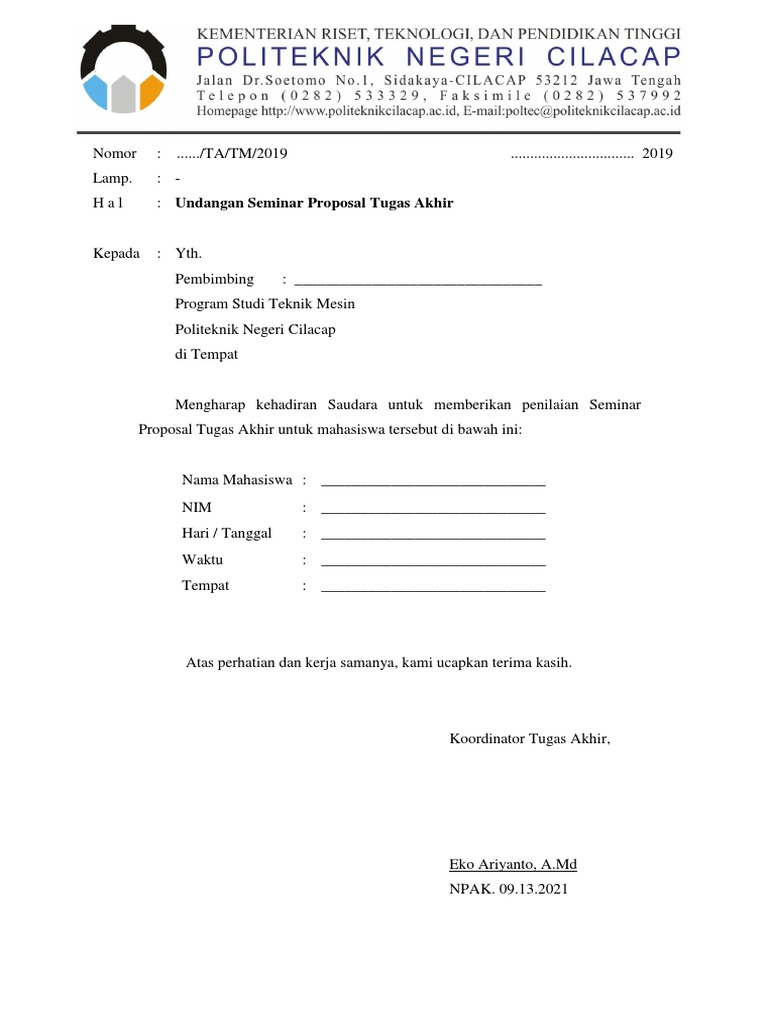 Undangan Seminar Proposal Tugas Akhir Prodi D3 Teknik Mesin Jurusan Teknik Mesin Politeknik Negeri Pontianak TAHUN AKADEMIK 2018/2019