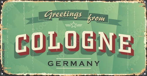 Vintage tin sign with German city. Cologne. Germany. City vintage poster vector. Layered vector no effect. Retro souvenirs or postcard templates on rust background. - Buy this stock vector and explore similar
