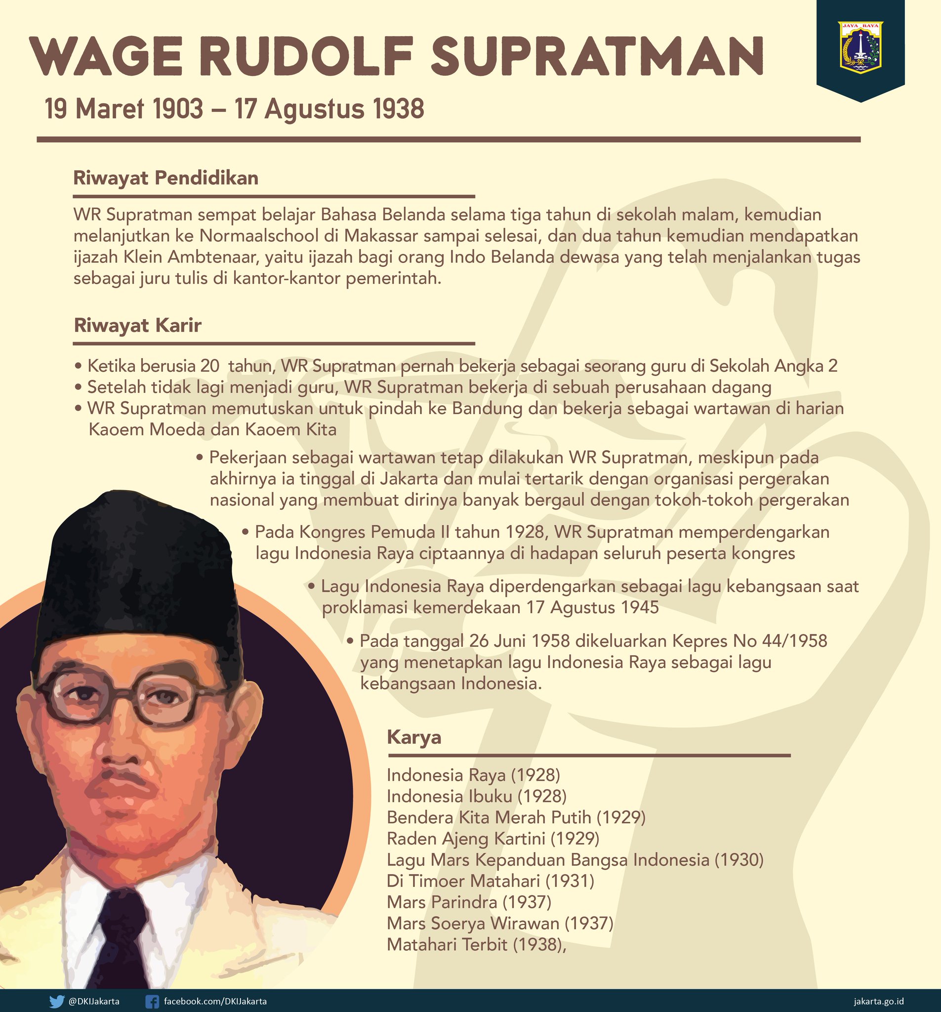 Pemprov DKI Jakarta : “Simak biografi singkat WR Supratman, sang pencipta lagu kebangsaan Indonesia Raya melalui infografis berikut
