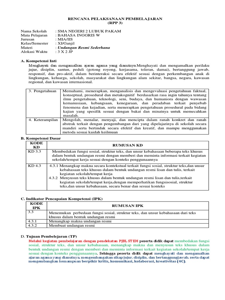 RPP Bahasa Inggris Kelas XI SMK Undangan Resmi - JURNAL ARTEFAK