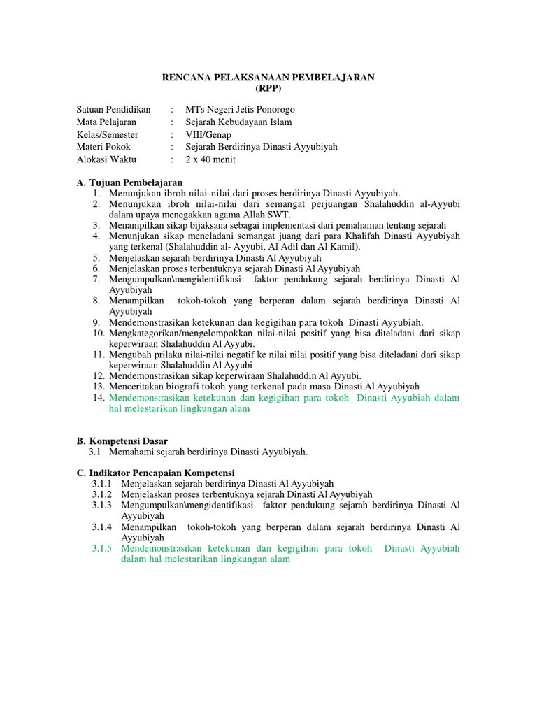 RPP_SKI_8_SMT_2.doc - RENCANA PELAKSANAAN PEMBELAJARAN(RPP Madrasah Mata pelajaran Kelas/Semester Materi Pokok Alokasi Waktu MTs N RONGKOP SKI | Course Hero