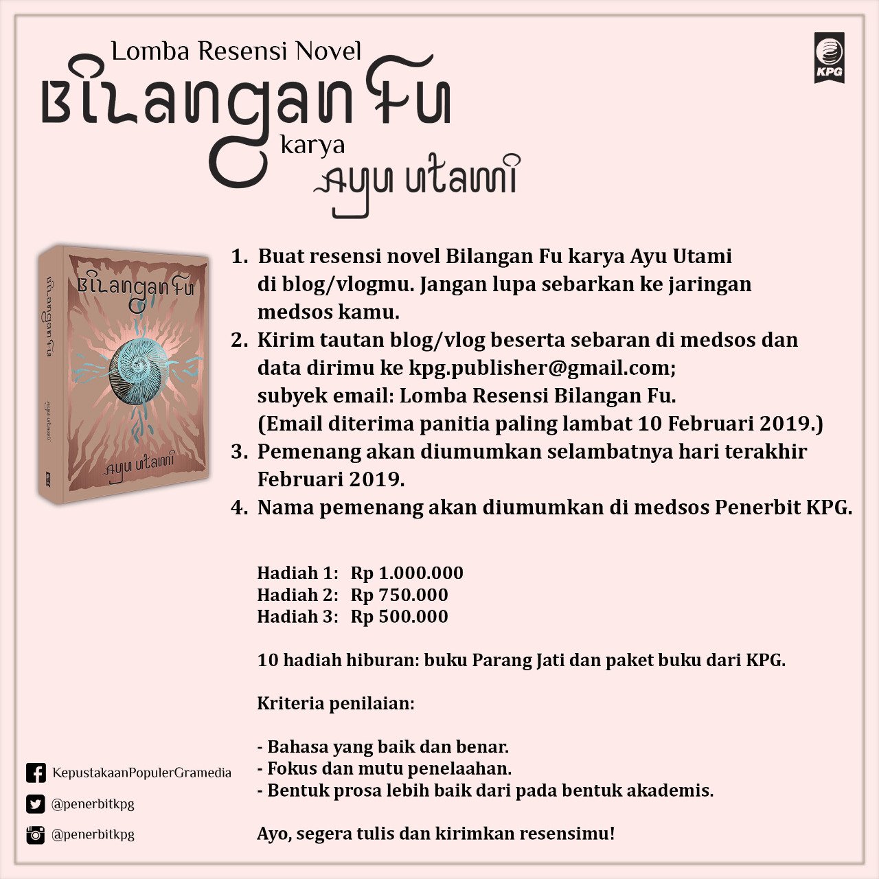 Penerbit KPG : “Halo, Bookmanias. Resensi buku “Bilangan Fu” karya Ayu Utami kami tunggu paling lambat 10 Februari 2019 pukul 23.59 WIB, ya. Caranya mudah, bisa simak di poster. #BilanganFu… https://t.co/SetWTVkmyb”