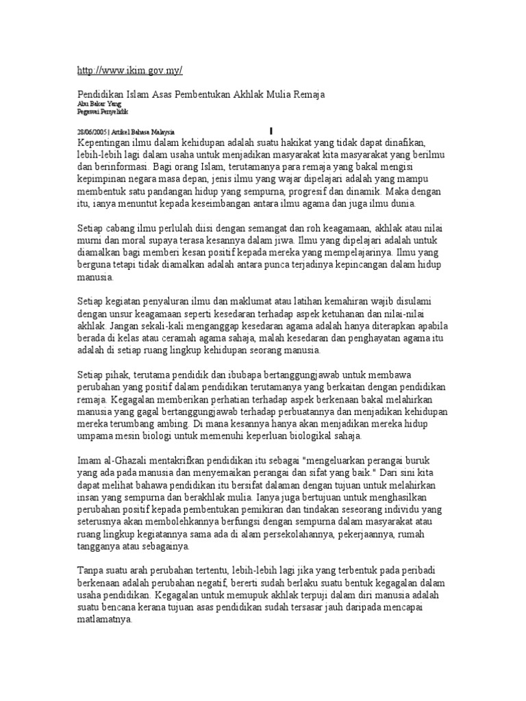 Pendidikan Islam Asas Pembentukan Akhlak Mulia Remaja