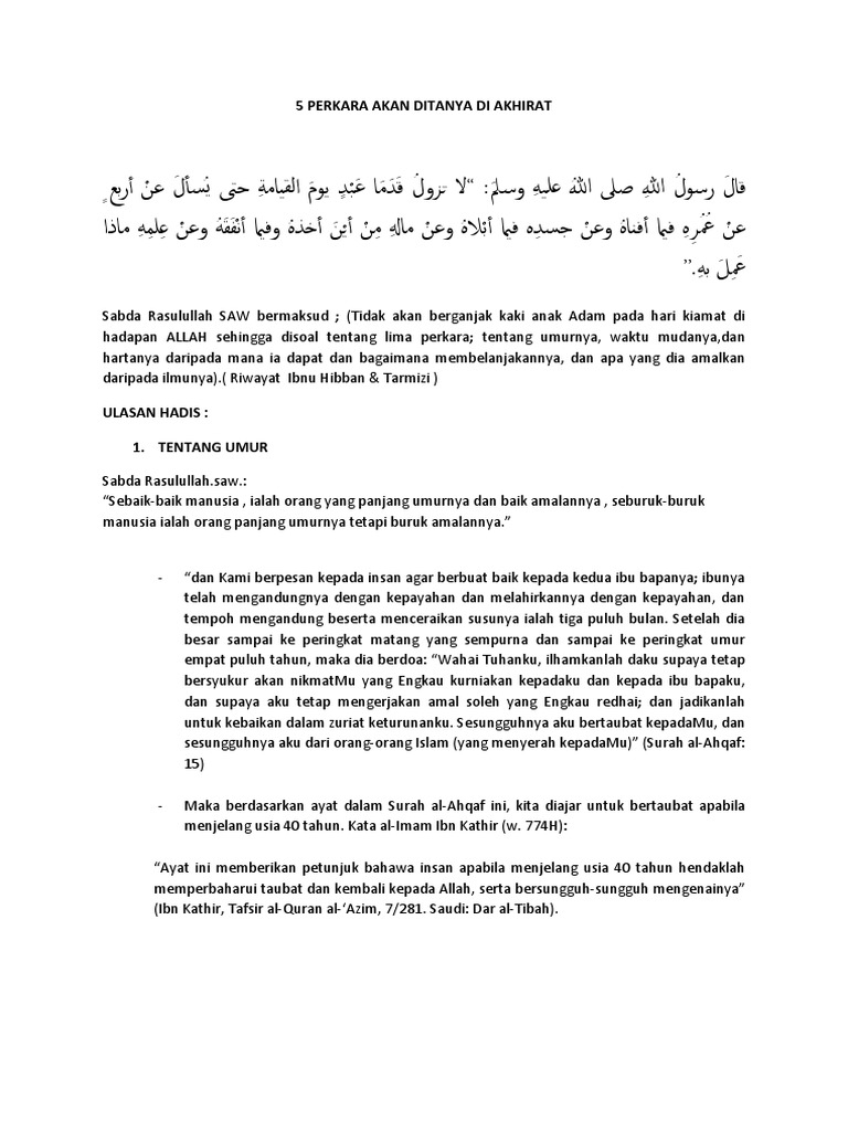 Tazkirah 5 Perkara Di Tanya Di Akhirat