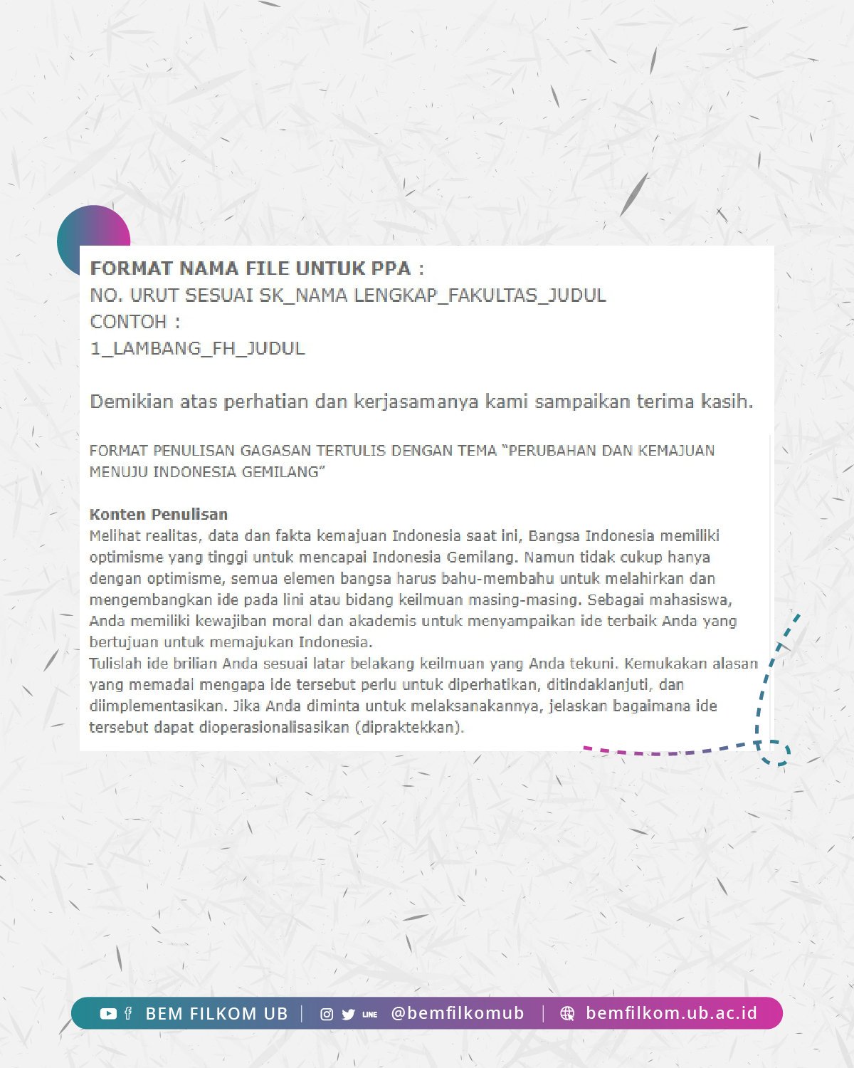 BEM FILKOM UB Twitter: " Catatan: 1. Membawa fotokopi KTP dan KTM (1 lembar). 2. Mengumpulkan esai dengan tema “Perubahan Dan Kemajuan Menuju Indonesia Gemilang”. Format penulisan esai dapat dilihat pada