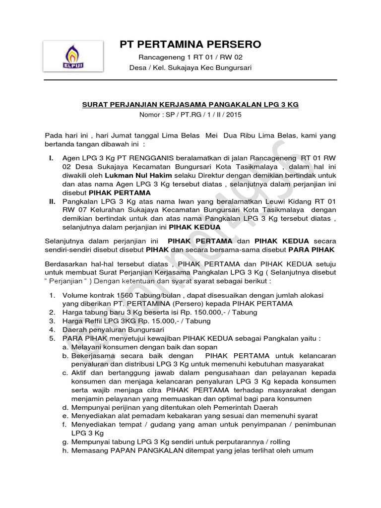 Surat Perjanjian Kerjasama Pangkalan LPG 3 Kg