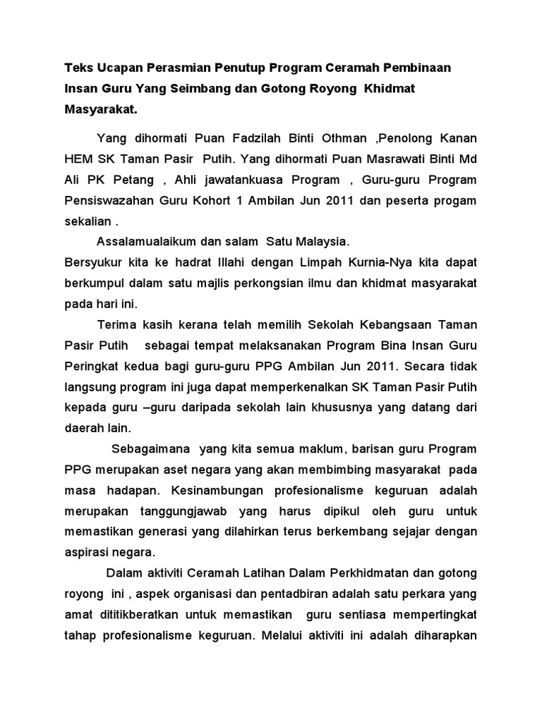 Teks Ucapan Perasmian Penutup Program Ceramah Pembinaan …
