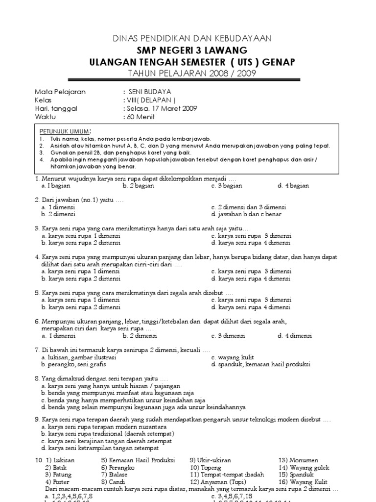 Soal Uts Seni Budaya Kelas 7 Semester 1 Dan Jawabannya - Guru Ilmu Sosial