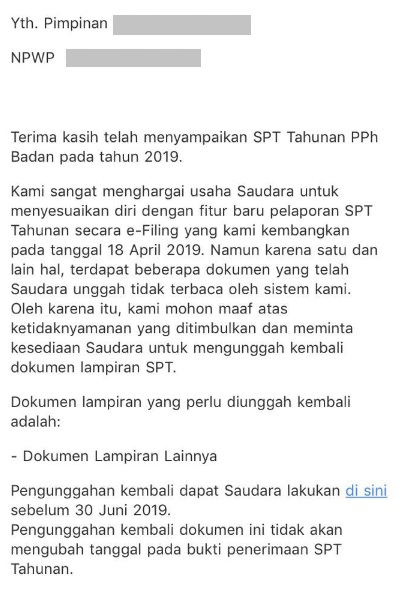 Dapat Email Upload Kembali Lampiran SPT e-Filing - eFaktur dan eSPT