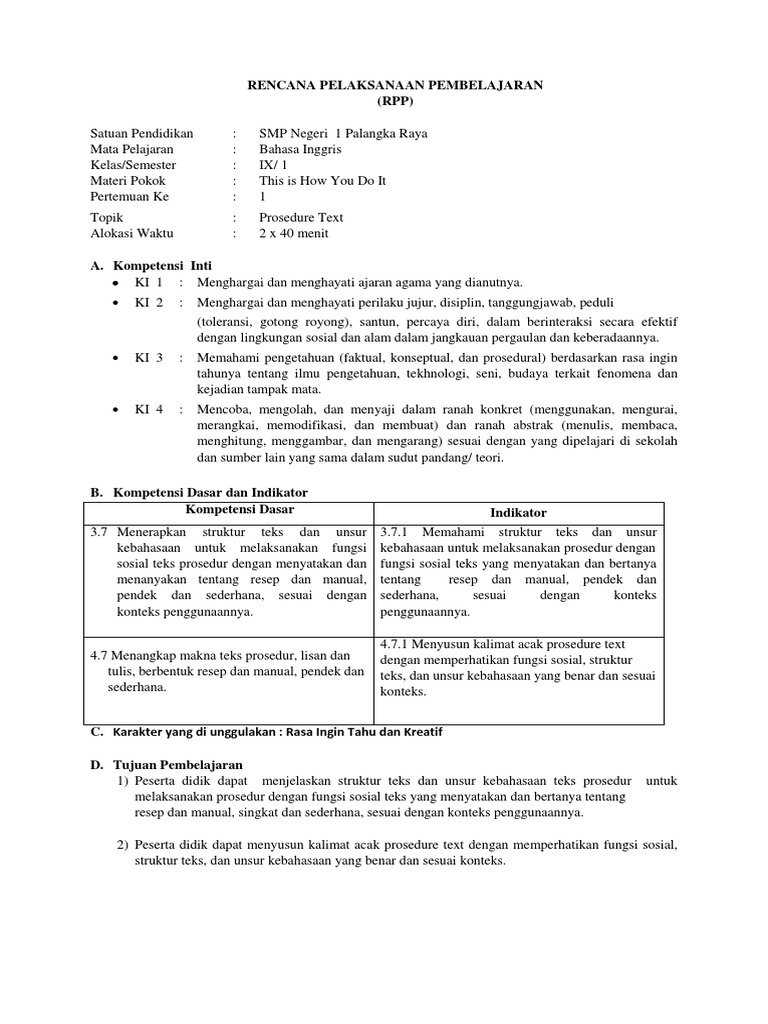 4. RPP Bahasa Inggris Kelas 9 SMP-MTs Semester 1 Materi PROCEDURE TEXT