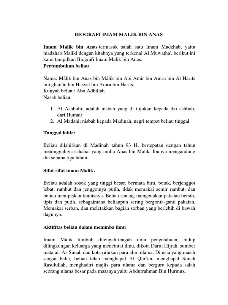DOC) Biografi Malik bin Anas dan Anas bin Malik | liza harahap - Academia.edu