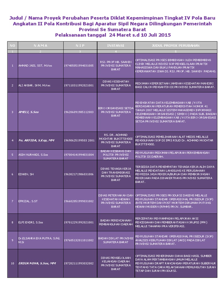 DATA ALUMNI DAN JUDUL PROYEK PERUBAHAN PESERTA DIKLAT KEPEMIMPINAN TINGKAT IV ANGKATAN XV DI B P S D M PROVINSI SUMATER
