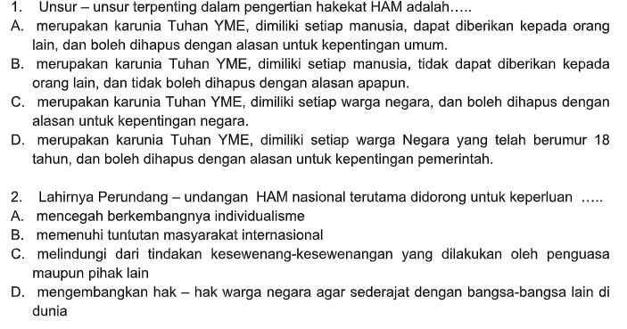1. lahirnya perundang undangan HAM nasional terutama didorong untuk keperluan.. a.mencegah - Brainly.co.id