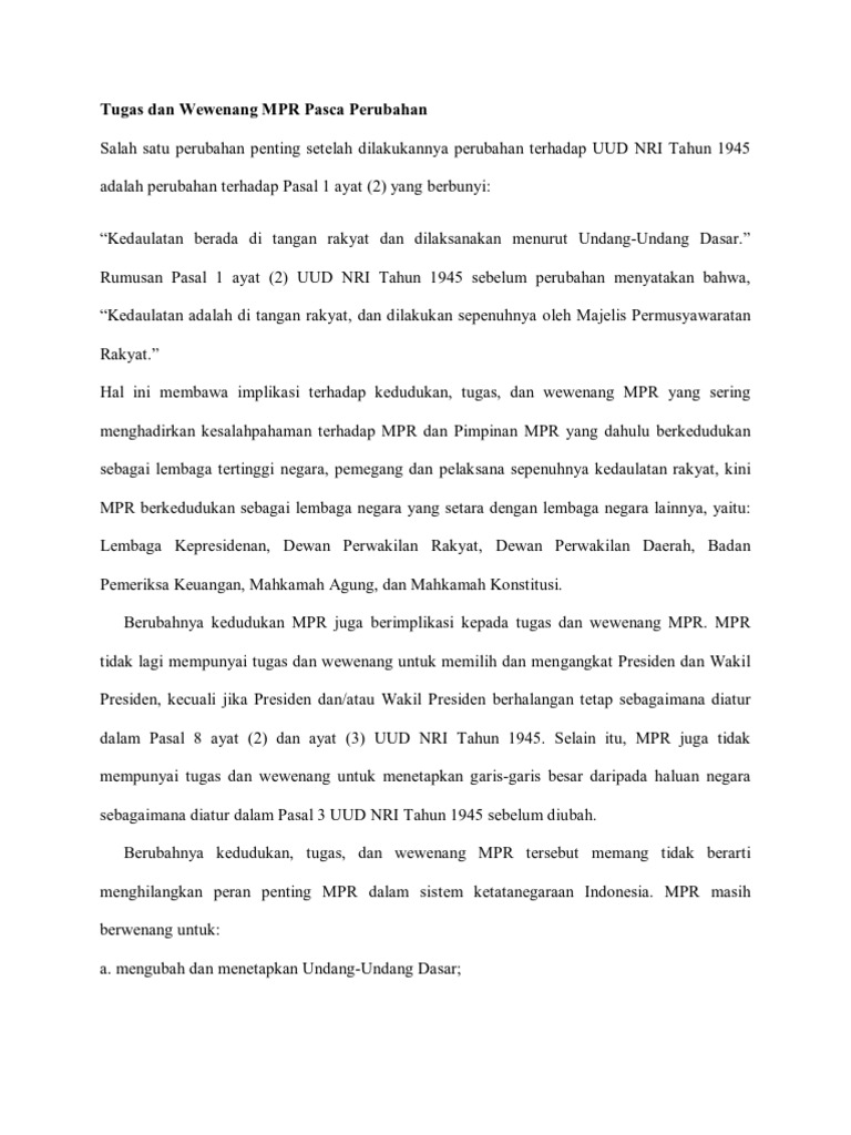 Tugas Dan Wewenang MPR Pasca Perubahan