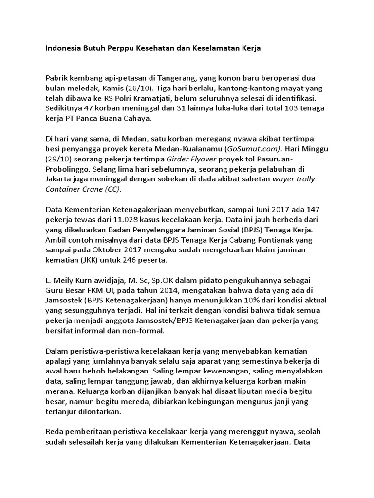 Indonesia Butuh Perppu Kesehatan Dan Keselamatan Kerja