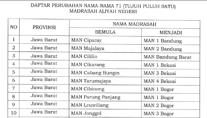 Daftar Perubahan Nama Madrasah Negeri di Provinsi Jawa Barat Berdasarkan KMA Nomor 212 Tahun 2015 - OKE SUKSES ZONE