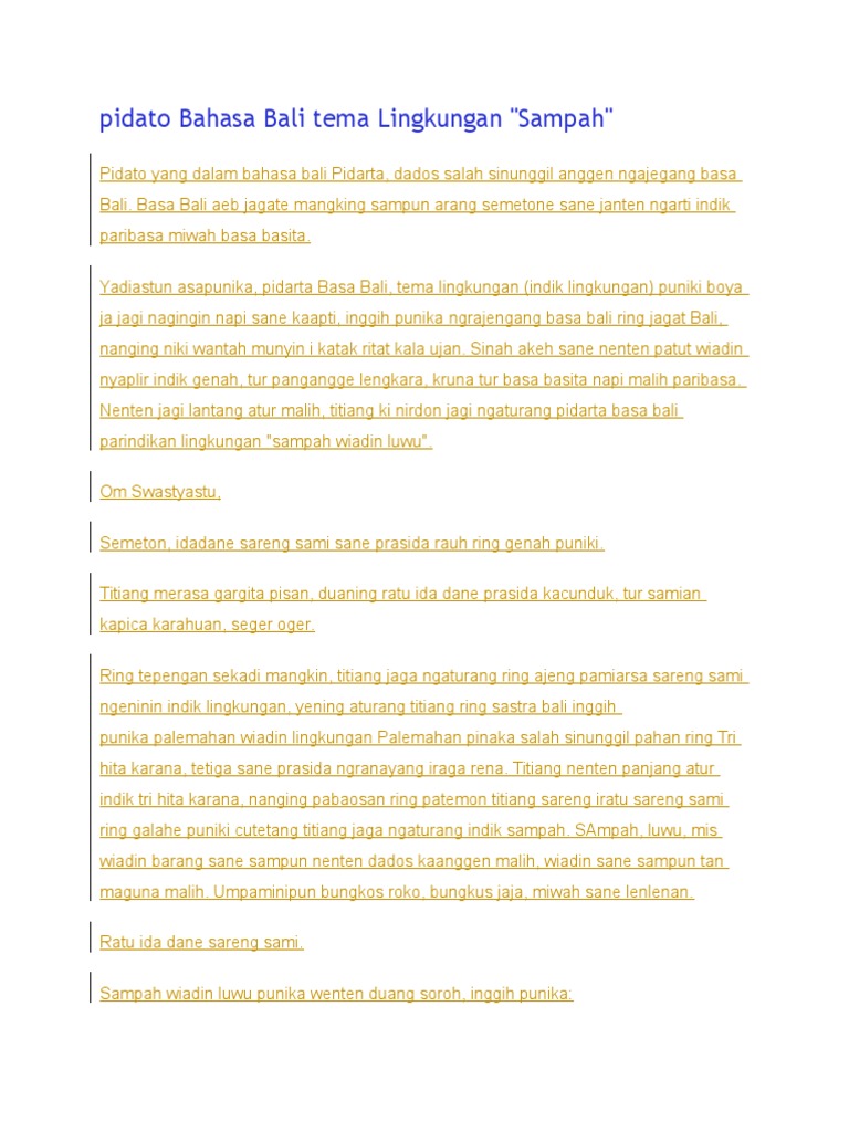 Contoh Pidato Bahasa Bali Pendek Tentang Lingkungan - Temukan Contoh