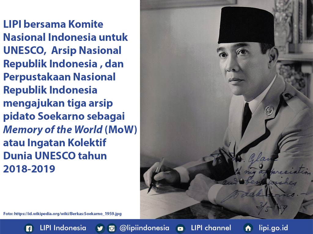 LIPI : “#SahabatLIPI, hari ini 6 Juni 1901 adalah hari lahir Soekarno, proklamator kemerdekaan dan presiden pertama RI. #LIPI bersama @ArsipNasionalRI @perpusnas1 dan Komite Nasional Indonesia utk UNESCO mengajukan tiga arsip pidato