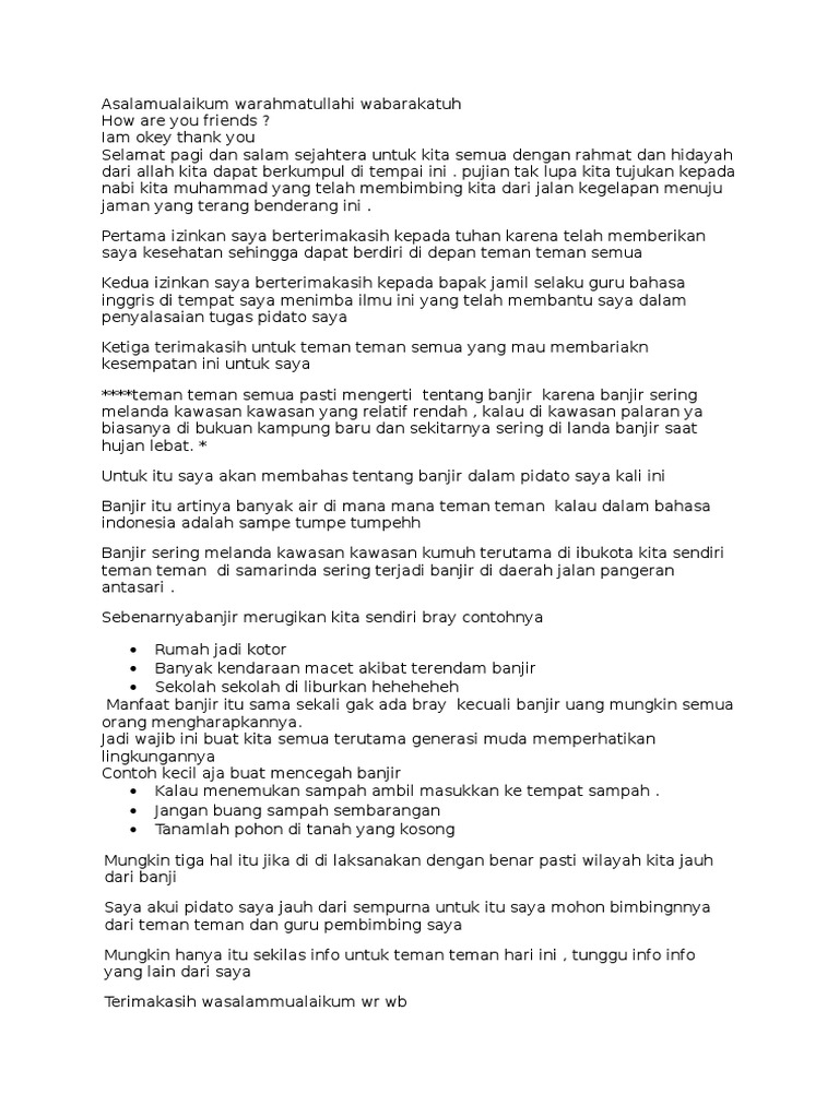 Halo, adakah yg bisa membantu saya untuk membuat pidato tentang banjir dalam bahasa Inggris? Isi - Brainly.co.id