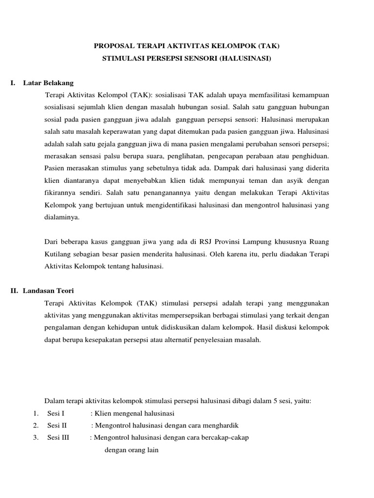 DOC) PROPOSAL TERAPI AKTIVITAS KELOMPOK (TAK) STIMULASI PERSEPSI SENSORI ( HALUSINASI | supron alimudin - Academia.edu