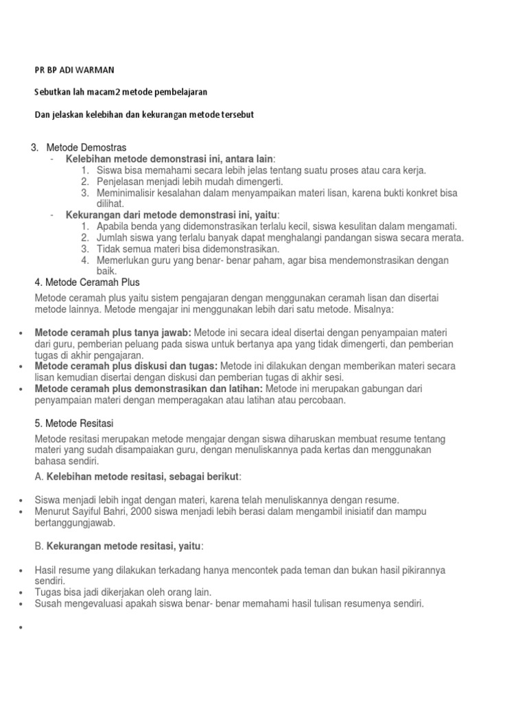 Pr Bp Adi Warman Sebutkan lah macam2 metode pembelajaran Dan jelaskan kelebihan dan kekurangan metode tersebut