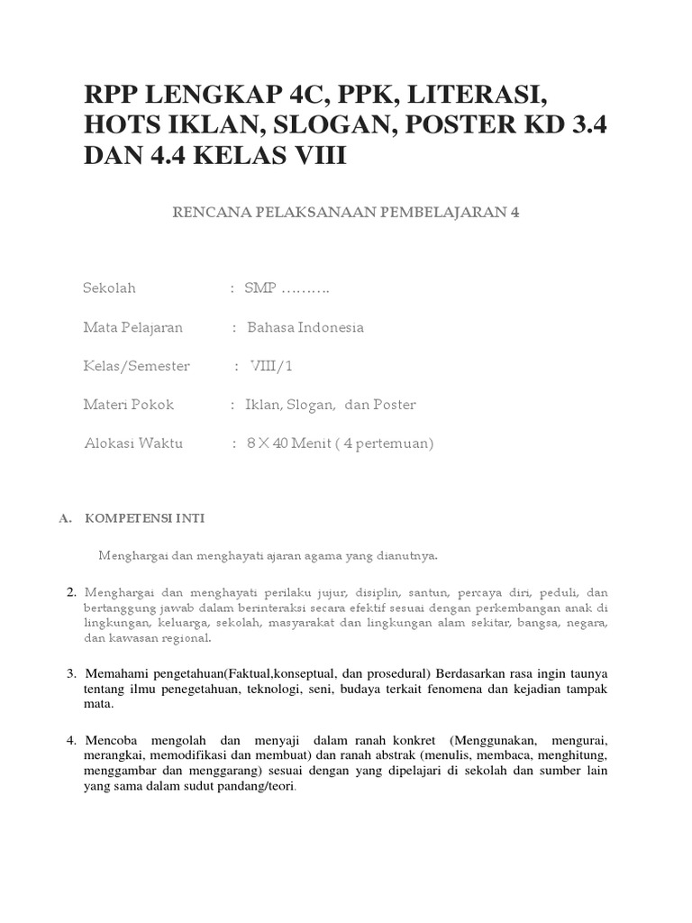 RPP LENGKAP 4C, PPK, LITERASI, HOTS IKLAN, SLOGAN, POSTER KD 3.4 DAN 4.4 KELAS VIII ~ ZUHRI INDONESIA