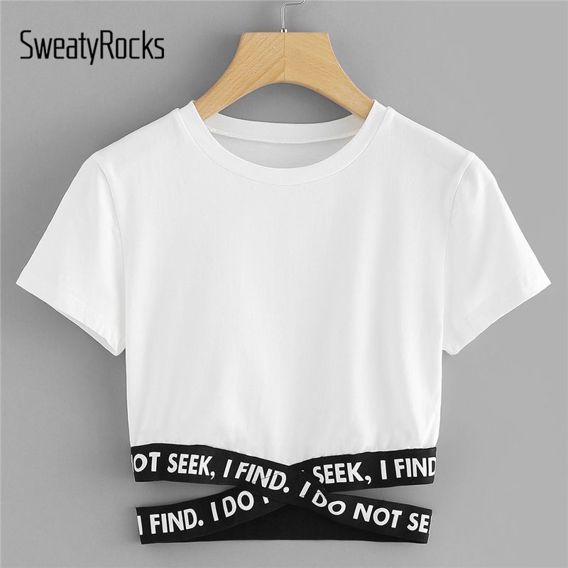 SweatyRocks Crop Top Women Contrast Slogan Criss Cross Waist Tee 2019 Summer Tops Asymmetrical Hem Short Sleeve Female T Shirt Y200109 Shirts Online T Shirt Creator From Shanye02, $9.57| DHgate.Com