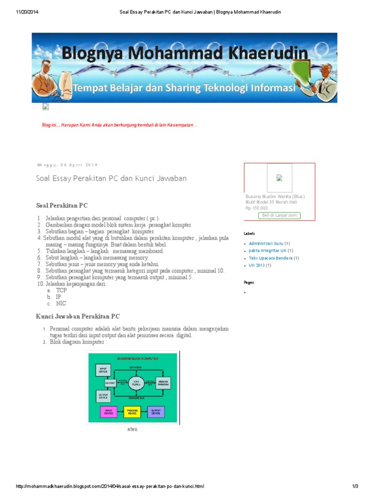 Soal Essay Perakitan PC dan Kunci Jawaban | Mohammad Khaerudin