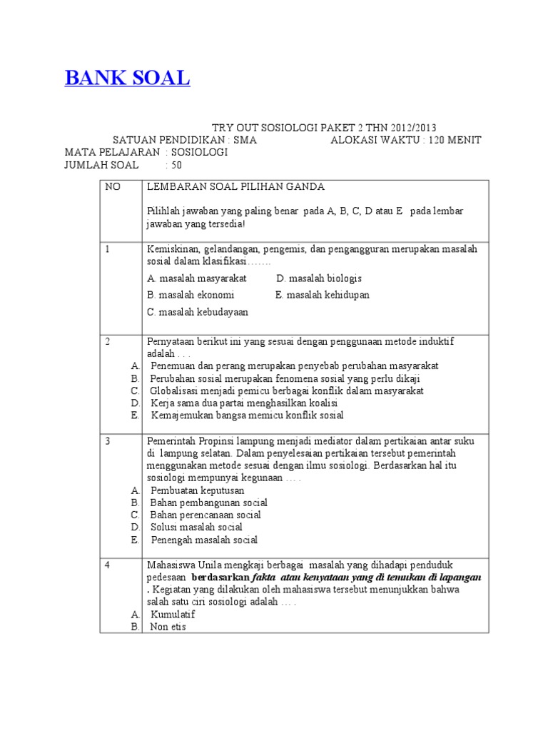 Contoh Soal Uas Sosiologi Kelas X Semester 2 (Pg Dan Essay) Beserta Tanggapan (Part-2) | sch. paperplane