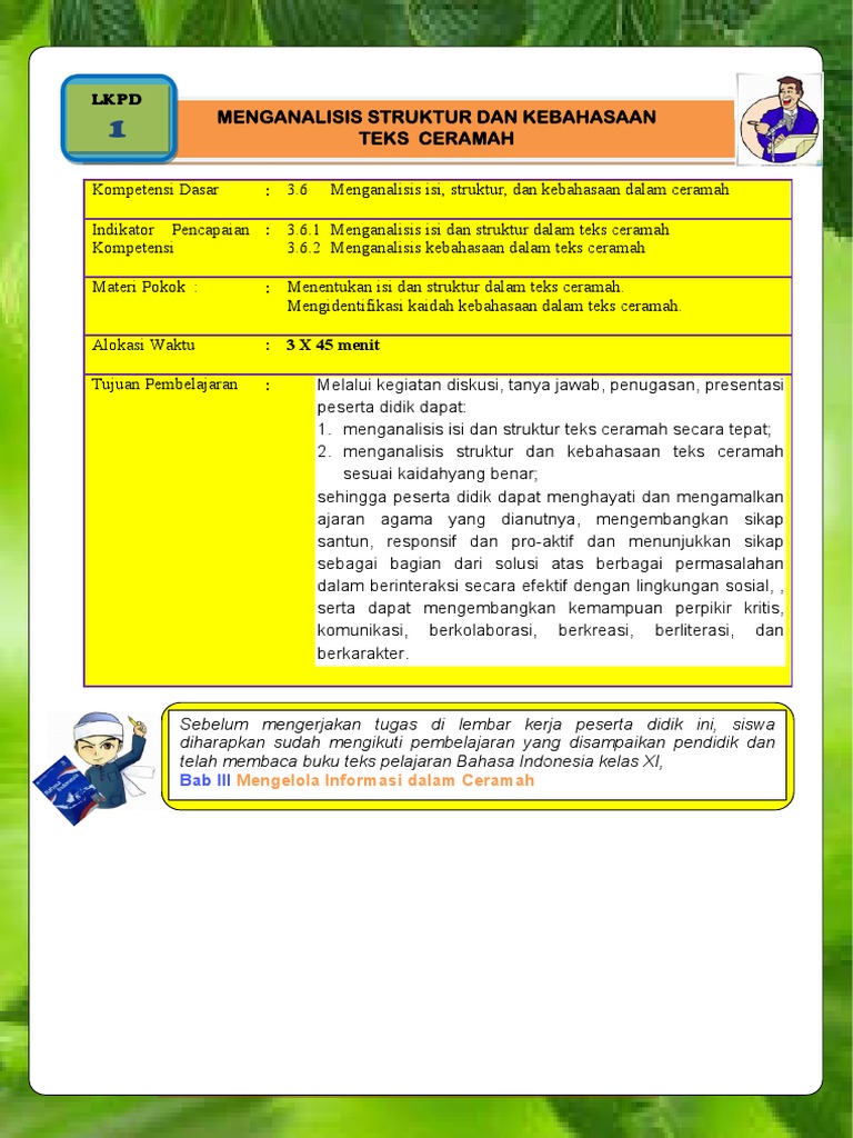 3.6 Menganalisis isi, struktur, dan kebahasaan dalam ceramah (C4: menganalisis) 4.6 Mengkonstruksikan ceramah tentang permasalahan aktual dengan memperhatikan aspek kebahasaan dan menggunakan struktur yang tepat - 24. UKBM KELAS XI 3.6 dan 4.6 CERAMAH