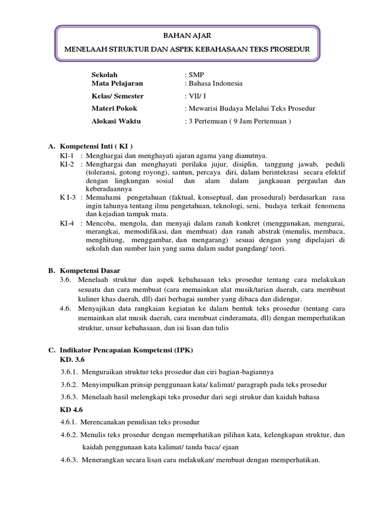 DOC) RPP BAHASA INDONESIA KELAS VII BAB 3 TEKS PROSEDUR.docx | Asisten Nur - Academia.edu