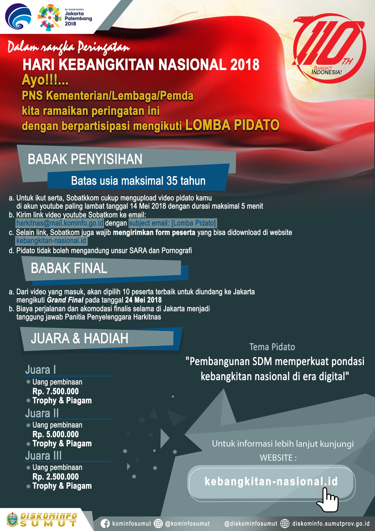 DINAS KOMINFO SUMUT Twitter: “Ayo!!!… PNS Kementerian/Lembaga/Pemda Meriahkan peringatan Hari Kebangkitan Nasional 2018 dengan mengikuti lomba pidato.. Teman Pidato–» “Pembanguna SDM memperkuat pondasi kebangkitan nasional di era digital” Untuk …