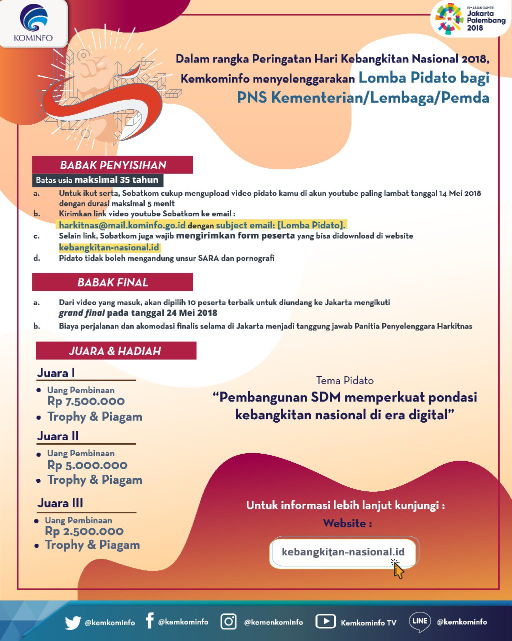 Kementerian Kominfo på Twitter: “LOMBA PIDATO #HARKITNAS2018 @kemkominfo gelar Lomba Pidato bagi PNS Kementerian/Lembaga/Pemda berusia max 35 tahun. @setnegri_ @setkabgoid @Kemdikbud_RI @Kemlu_RI @KemenkeuRI @KEMENPORA_RI @rudiantara_id… https://t.co …