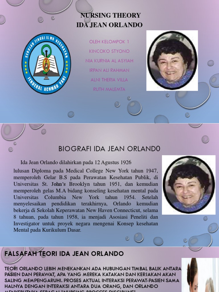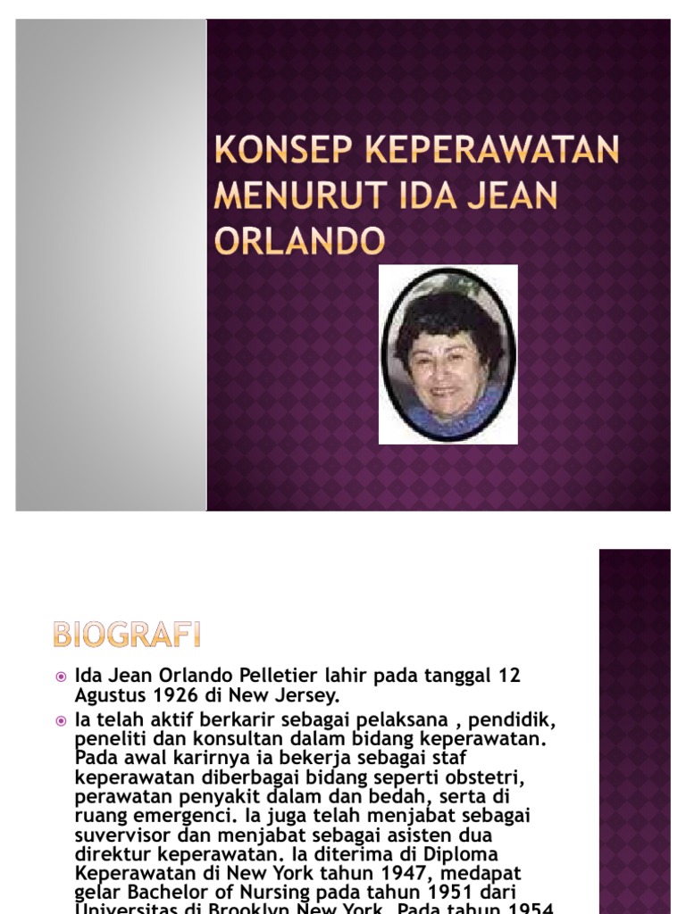 TEORI KEPERAWATAN IDA JEAN ORLANDO A. Latar Belakang Ida Jean Orlando Ida Jean Orlando dilahirkan pada 12 Agustus 1926, lulusan