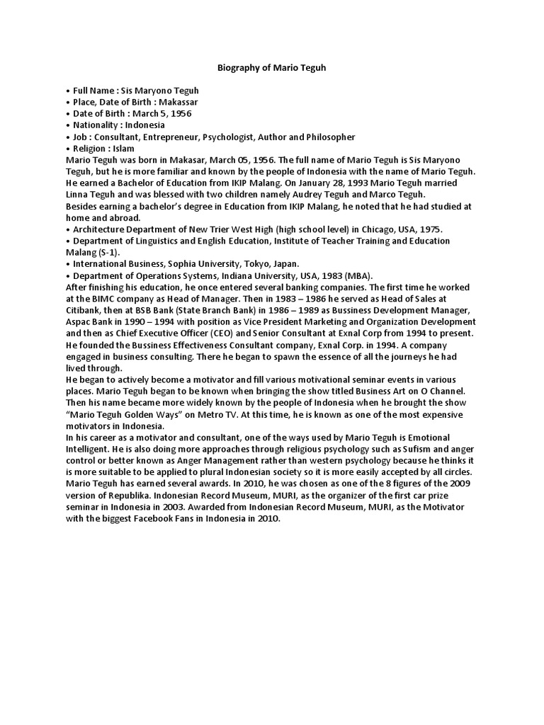 Biografi Mario Teguh Dalam Bahasa Inggris Singkat dan Terjemahannya