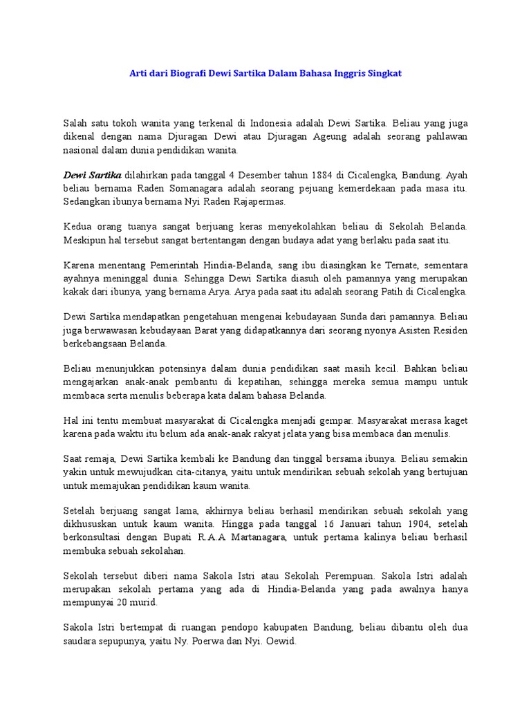 Biografi Dewi Sartika Dalam Bahasa Inggris Singkat Beserta Artinya