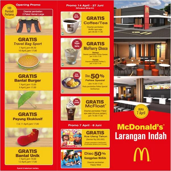 McDonald’s Indonesia a Twitter: “Selamat pagi! Hari ini akan dibuka McDonald’s baru di Larangan Indah, Ciledug. Mampir ya utk dapatin byk hadiahnya! http://t.co/YVI7lFUfEF”