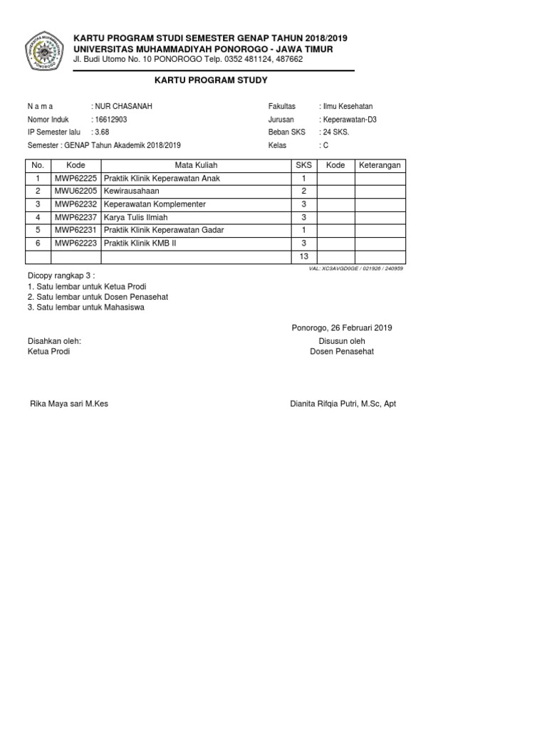 Kartu Program Studi Semester Genap Tahun 2018/2019 Universitas Muhammadiyah Ponorogo - Jawa Timur
