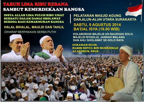 IG : @AGENDASOLO Twitter: “MALAM INI Safari Maulid Akbar, Solo kota Sholawat #Tabuh5000Rebana. Penceramah Habib Novel | pkl 19.30 | Alun2 Utara http://t.co/cwVuuFjE4m”