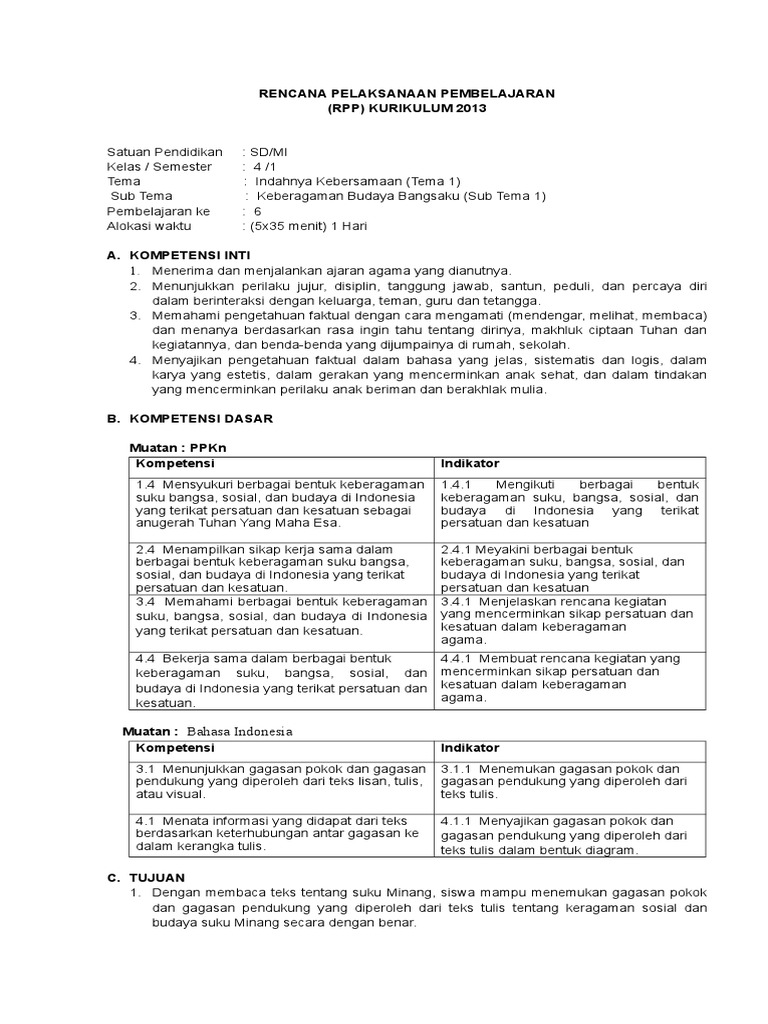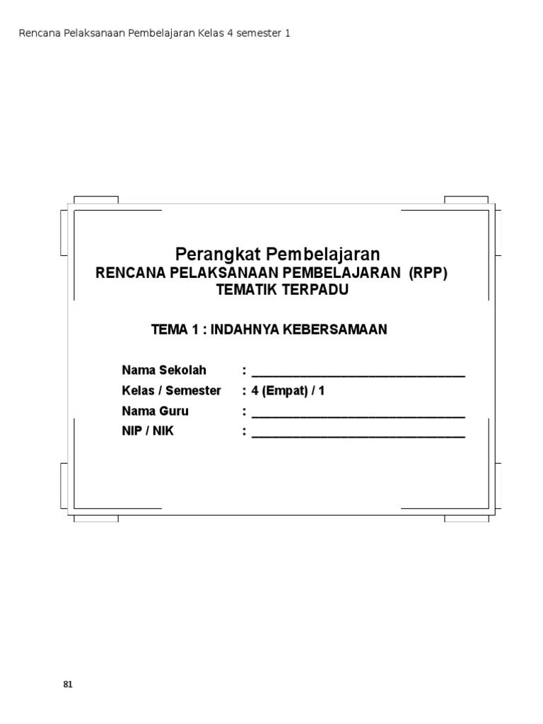 Rpp kurikulum 2013 sd kelas 4 (iv) semester 1 tema 1 indahnya keber…